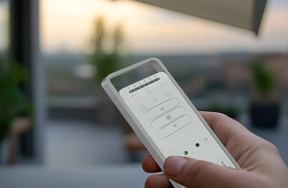 Mit der Funkfernbedienung fahren Sie Ihre Markise bequem per Knopfdruck aus und ein – ohne aufzustehen. Mit mehreren Kanälen auf der Fernbedienung steuern Sie auch mehrere Anlagen – so werden die Markise und beispielsweise eine zusätzliche Senkrechtmarkise für Sicht- oder Blendschutz getrennt voneinander gesteuert.