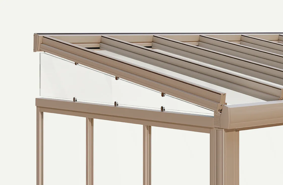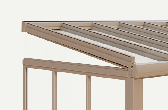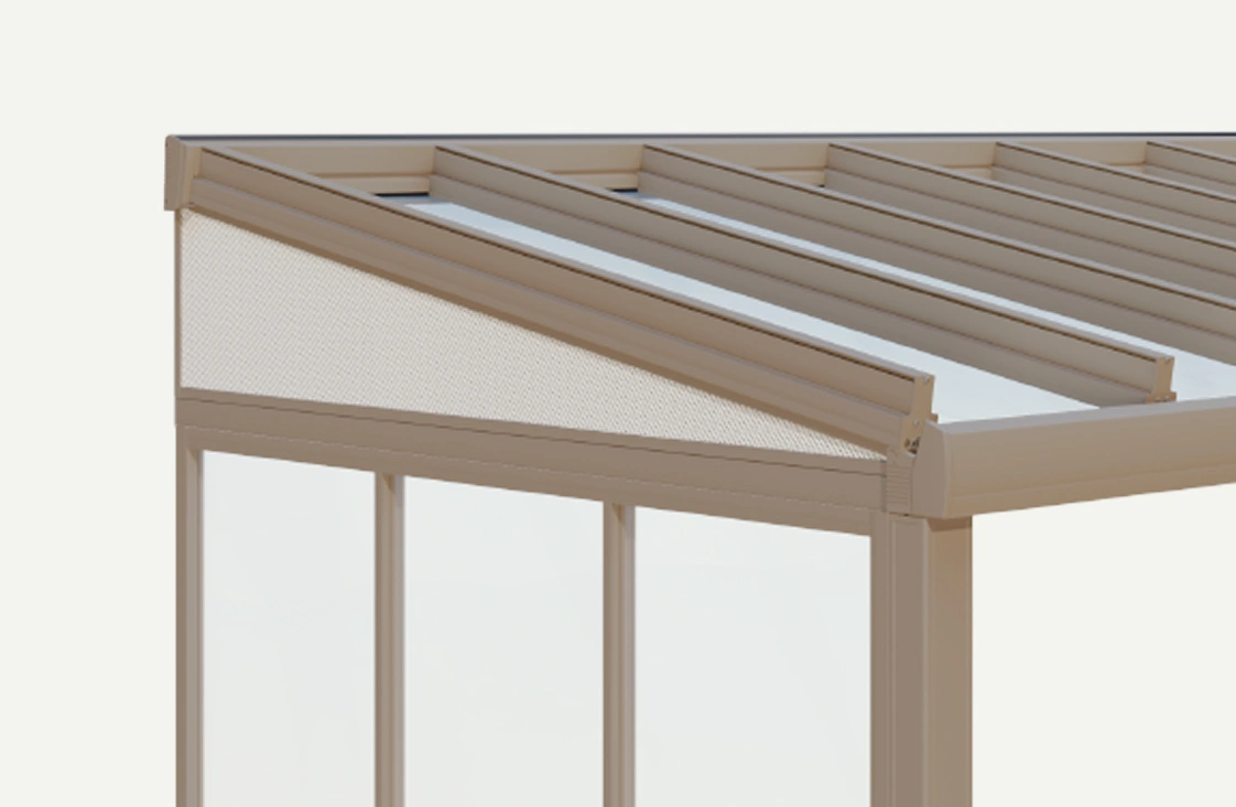 The textile alternative to glass. The triangular opening can be elegantly closed with a fabric from our Lewens awning fabric range – without any fixed glass closure. Compatible with all Murano glass roofs.