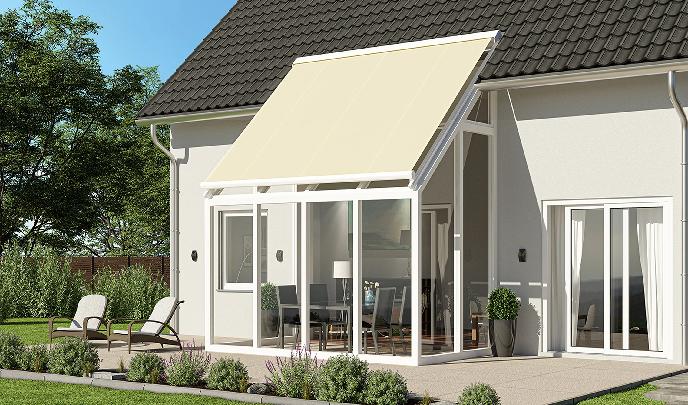 Unterglasmarkise, sicher integriert und zuverlässig im Einsatz gegen Sonne.