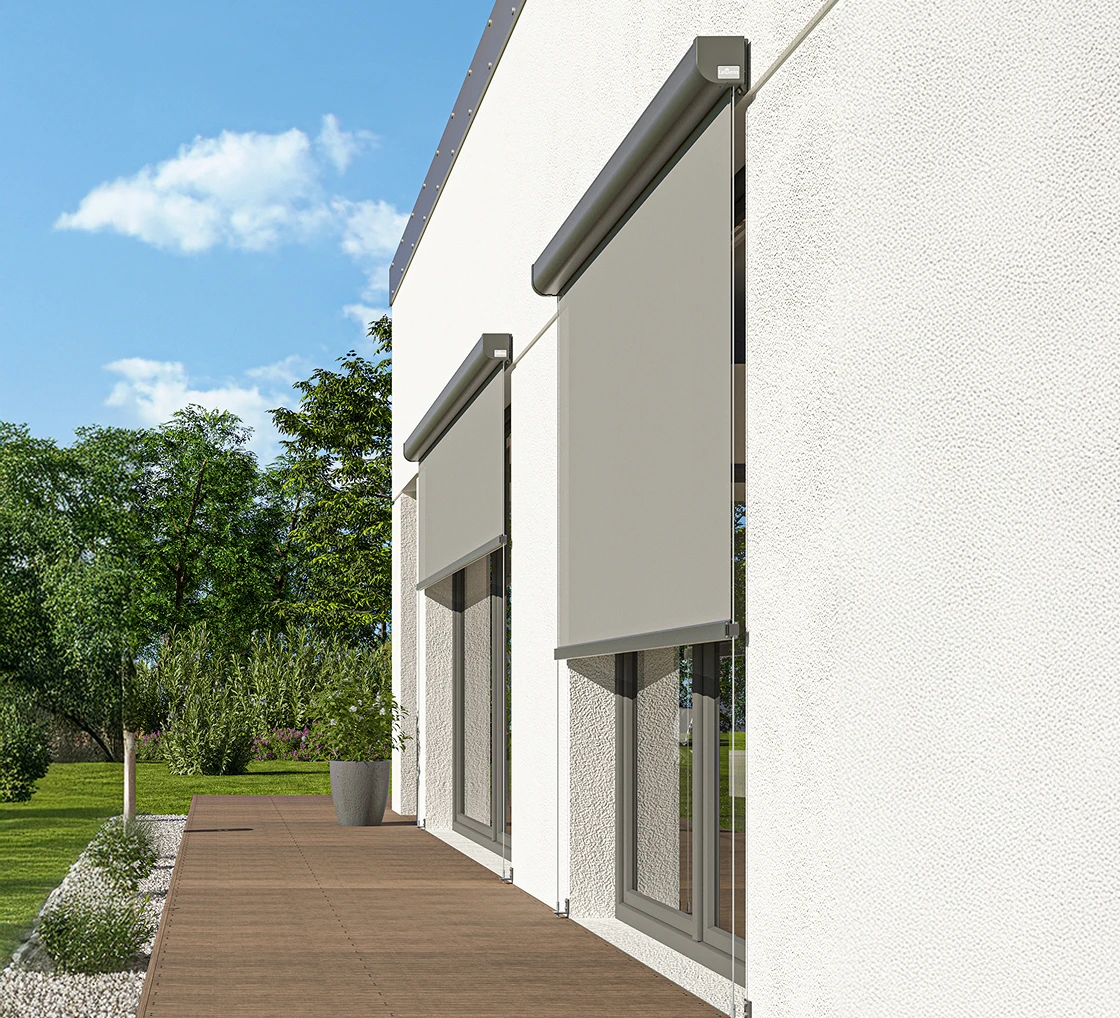 Fassadenbündige Screen-Markise mit Stil – Sicht- und Sonnenschutz in zwei Designs.