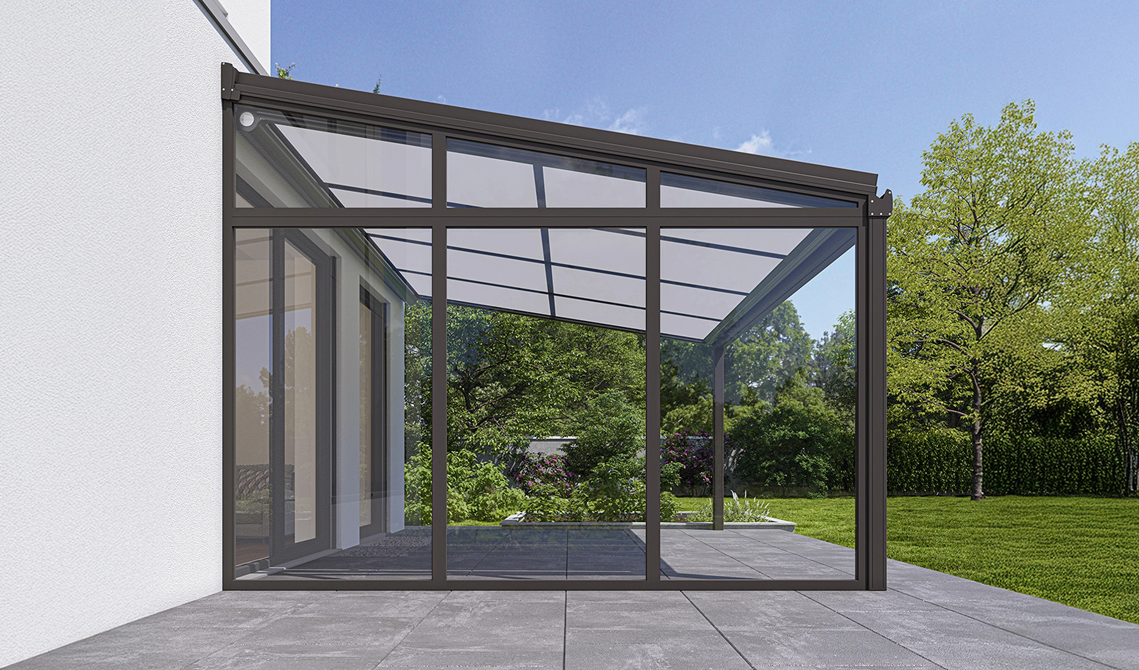 Glasdach mit integrierter Markise – bestens geschützt mit integriertem Sonnenschutz.