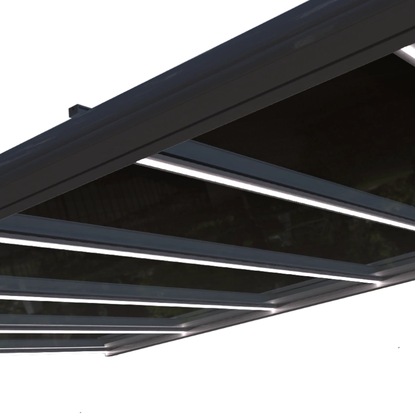 Glasdach mit Zip-Markise – straffer Tuchsitz und lückenloser Sonnenschutz.