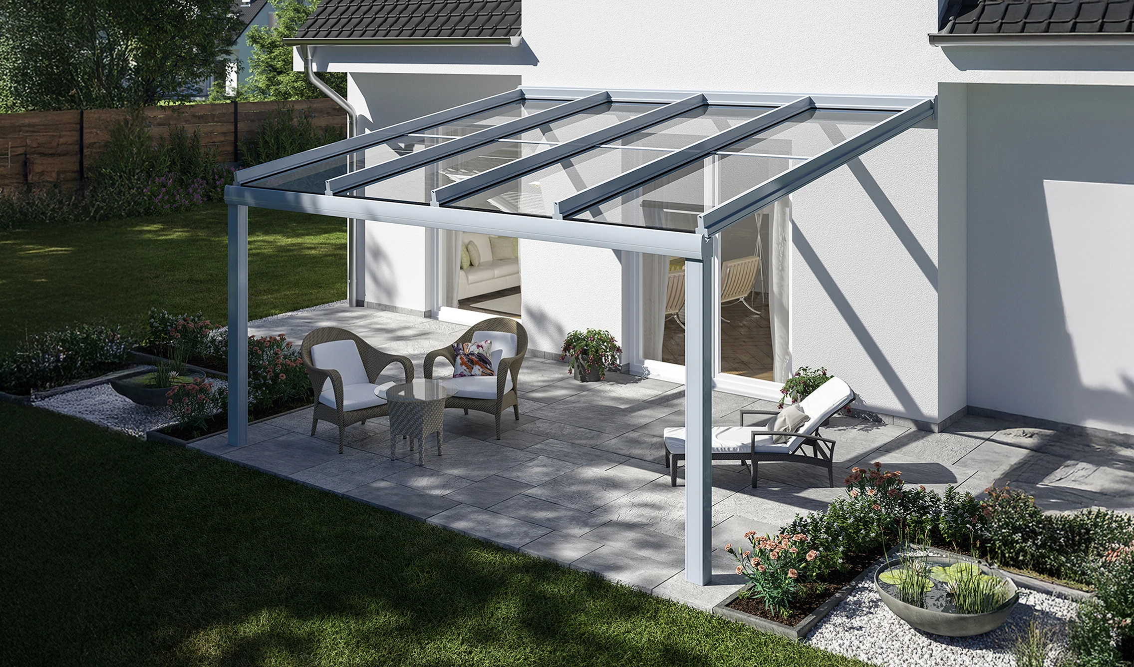Glasdach für große Terrassen – eleganter Wetterschutz zu jeder Jahreszeit.